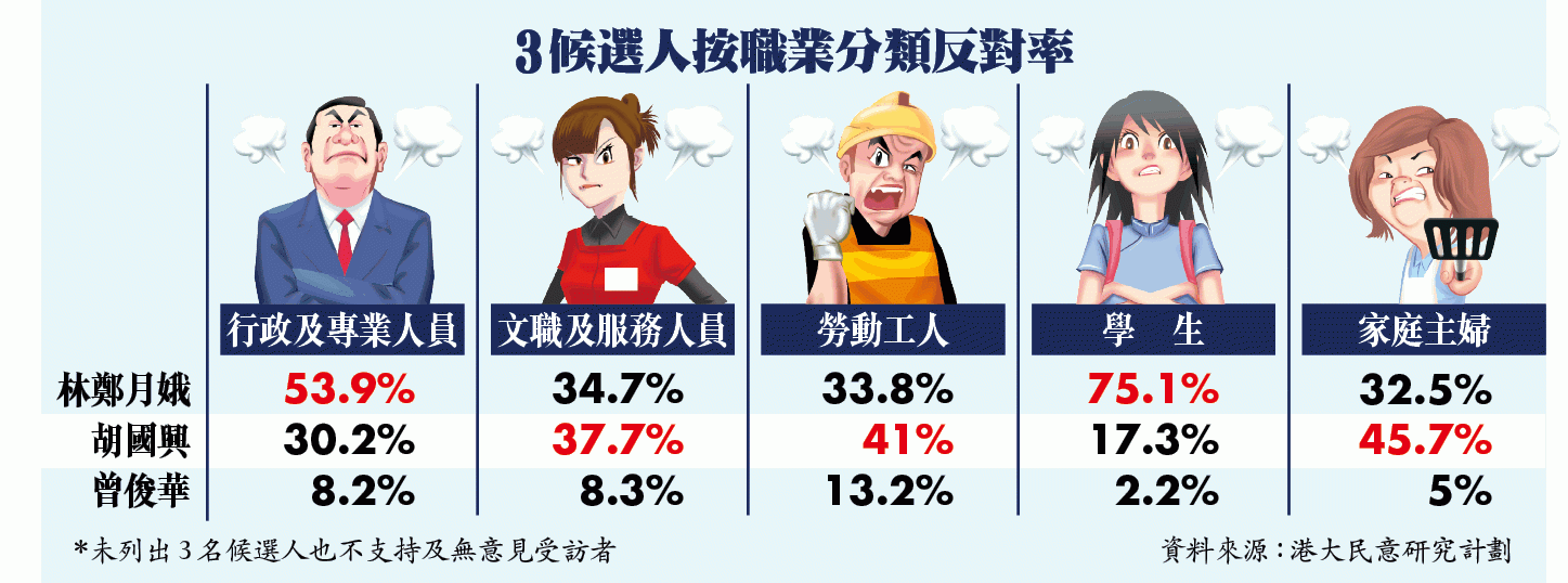另一方面,林鄭月娥亦未能討好行政及專業人員與學生兩類別人士,前者有約54%人反對她出任特首,後者更多達75%。恰恰這兩類人反對曾俊華的比率最少,只有僅8.2%的行政及專業人員及只有2.2%的學生反對曾當選。