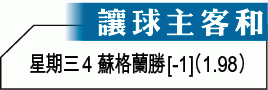 蘇格蘭在周三於喜伯年迎戰加拿大的友賽雖然未能「夫添」,但加拿大今役以年輕球員為主,加上是新帥森巴奴的首仗,對球隊了解或不足,因此,不妨直取「讓球主客和」[-1]的蘇格蘭「主勝」。