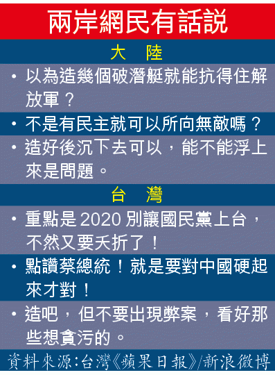 台灣現役4艘潛艦分別購自美國和荷蘭,屬老舊產品;美國2001年同意售台8艘常規潛艦,但因北京壓力等至今無下文。馬英九時代曾宣佈推動自造,但兩岸關係和緩,一拖再拖。去年5.20蔡英文上台後積極推動「國防自主」政策,除了「潛艦國造」,還打算建造6至8艘6,000噸到8,000噸的神盾級主戰艦,取代台灣現有的紀德級軍艦。