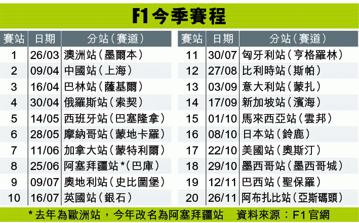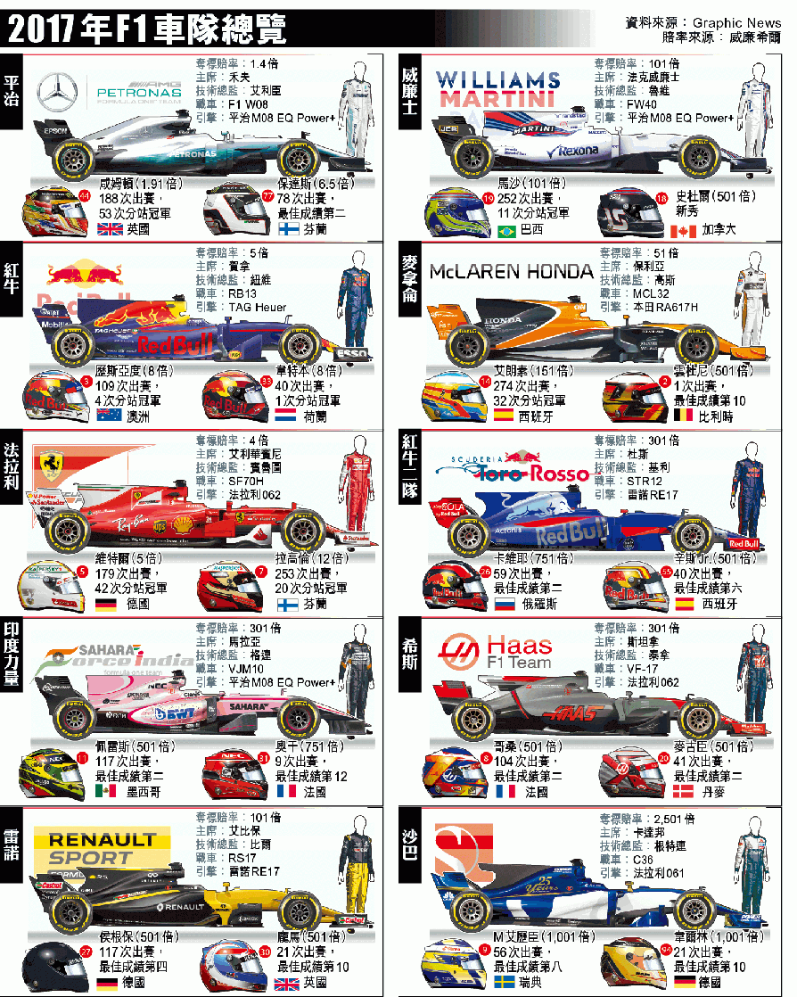2017年F1賽季下周日(26日)在澳洲墨爾本正式開鑼,法拉利在季前試車一洗頹風,憑拉高倫及維特爾造出最快圈速,令車迷期待他們能打破平治近季的壟斷,繼2008年再次贏得車隊冠軍。