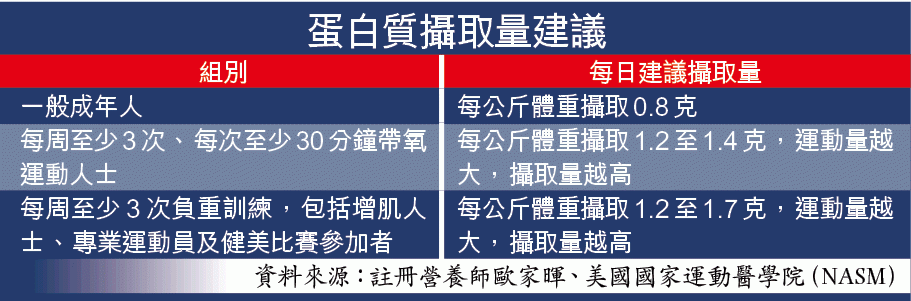 港人多為「食肉獸」,蛋白質飲食要達標並不困難,但歐家暉指出,對於要做負重訓練的增肌一族、專業運動員及健美參賽者,蛋白質需求量會更高,攝取量建議為每日每公斤體重介乎1.2至1.7克蛋白質。若能從日常飲食攝取足夠蛋白質,此時才要考慮食用較方便的蛋白粉,建議先「計啱數」才決定食用量,例如1名體重70公斤的增肌人士,每日需要攝取119克蛋白質,估計從飲食攝取約75%蛋白質,那麼餘下約25%蛋白質可靠蛋白粉補充。