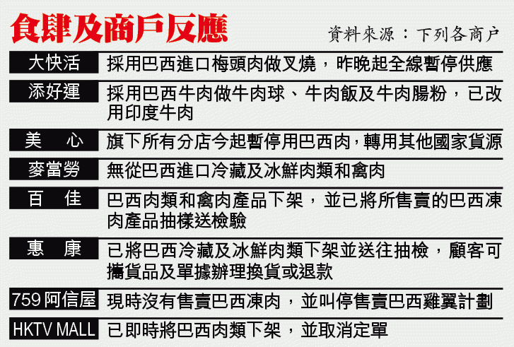 美心回覆稱集團旗下所有分店今日起暫時停用巴西肉類,並轉用其他國家貨源代替,個別分店或要轉換餐牌或食品。翠華集團亦即晚停用巴西肉食。連鎖快餐店麥當勞、澳門茶餐廳、馬鞍山白石燒烤場及西貢秘密花園燒烤場均稱無採用巴西肉。零售方面,惠康超市已指示各分店將巴西冷藏及冰鮮肉類和禽肉下架,顧客可換貨或退款。百佳一度稱所售巴西肉抽查後無問題,至晚上亦轉軚決定下架。