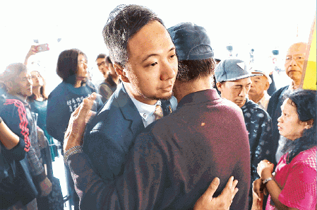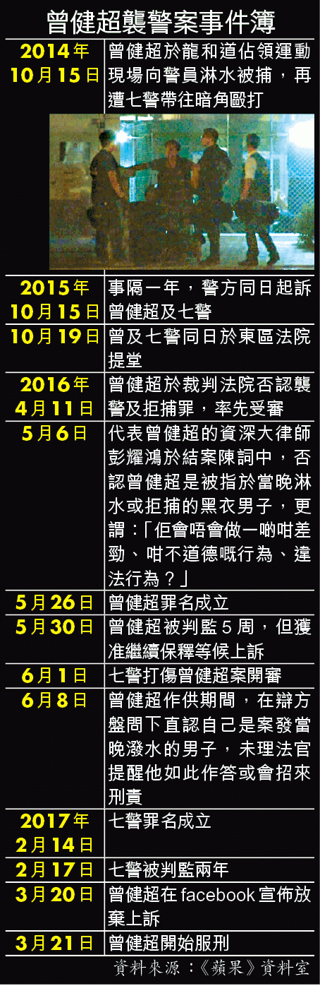 【本報訊】佔領運動時遭七警帶到暗角打傷的公民黨前成員曾健超,去年因襲警及拒捕罪判囚5周,獲准保釋等候上訴。惟他前日宣佈放棄上訴,昨到高院通知法官並開始服刑。他坦言放棄上訴原因之一是七警已定罪,服刑為承擔責任,希望七警也明白這道理。曾離開犯人欄前脫下黃絲帶襟針及黃色袖口鈕予戰友,帶笑向支持者揮手道別。