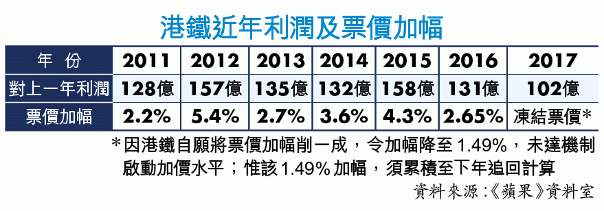 港鐵過去7年坐擁過百億元盈利,票價按機制只加不減為人詬病。港府去年提早一年與港鐵檢討票價機制,不過上周公佈的檢討結果,票價方程式維持不變,港鐵只願提供額外優惠紓緩票價加幅。新優惠措施包括將今年票價加幅削減10%,以及未來5年協議期內,每年提供至少為期半年的每程3%八達通車費折扣等。