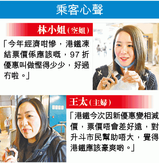 有乘客不滿新優惠的折扣率,較第二程九折低。至於現有5款月票,未來一年亦不會加價。7月1日起發售的都會票,有效期亦會由30天延長至40天。