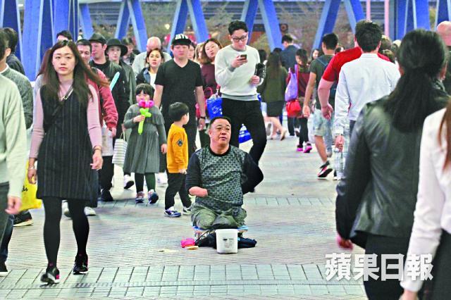 【本報訊】中環ifc對開天橋、柯士甸港鐵站附近、佐敦行人隧道等旺區,近年經常出現一批備有擴音器的「唱K輪椅乞丐」,有的四肢殘障、有的雙腿變形、有的是侏儒身軀,他們不時在街頭落力賣唱。《蘋果》經過一段時間的跟蹤追查,發現他們都是來自深圳一個慈善團體,名為「點亮生命殘疾人藝術團」,這些傷殘人士像藝人一樣接受專門訓練,在各地登台表演,亦有人為了賺快錢,成為舞台下的街頭演藝人,被安排來港賣唱行乞。