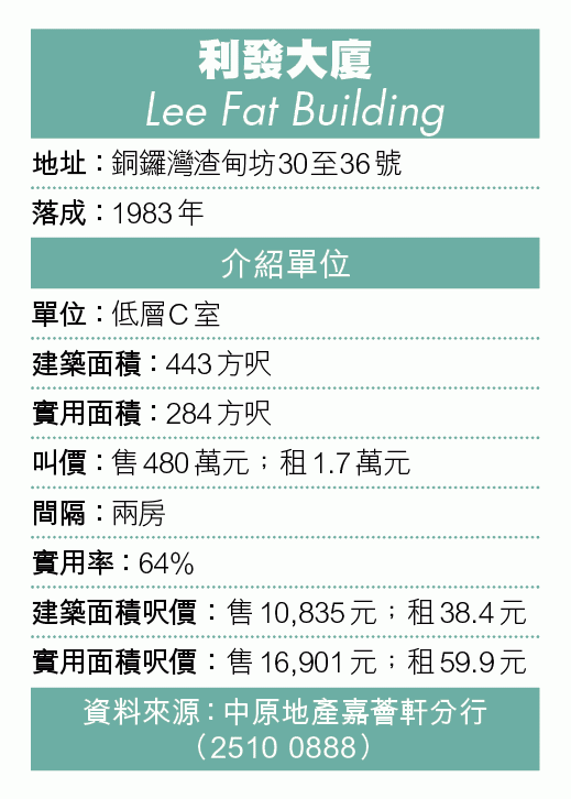 銅鑼灣渣甸坊有「港島女人街」之稱,兩旁排檔林立,販賣女士衣物配飾,充滿地道特色。中後段有若干住宅物業,利發大廈於1983年落成,相比附近唐樓不算太舊,設有兩部升降機上落各層,每層3伙,等𨋢時間不會太長,每月管理費500餘元屬實惠。