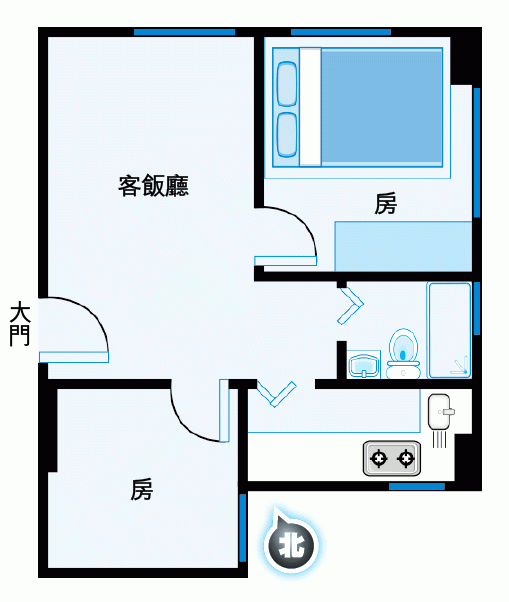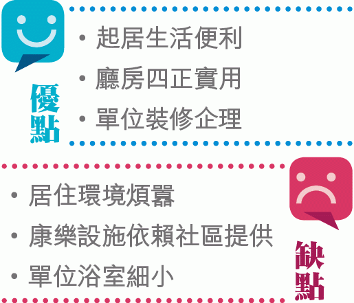 單位間隔兩房,一大一細,大房設兩扇窗戶,光猛通風,兼可擺放雙人床及衣櫃,地方不擠迫。細房門位靠邊,因角落有柱位,限制單人床必須橫放,衣櫃在門邊,才不阻擋窗戶透光。廚房長方形,容得下雪櫃及洗衣機,不用放出廳,惟浴室淺窄,洗手盆及企缸的骰,適合瘦身男女使用。