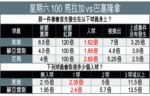 巴塞在周三西甲主場以3:0擊敗西維爾,中場拿傑迪錫與中堅碧基都因累積五面黃牌要在今場停賽,加上球隊於下周二歐聯八強作客祖雲達斯,教練安歷基會在陣容上作出變動。馬拉加在上輪聯賽小勝希杭結束六戰不勝,該隊進攻火力弱近七戰僅入三球,今場難有大手交易,捧[3.5球]「細」。