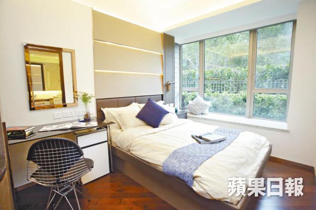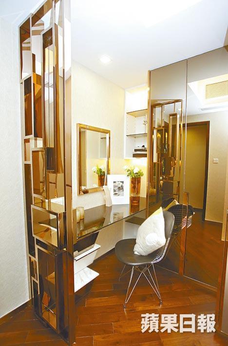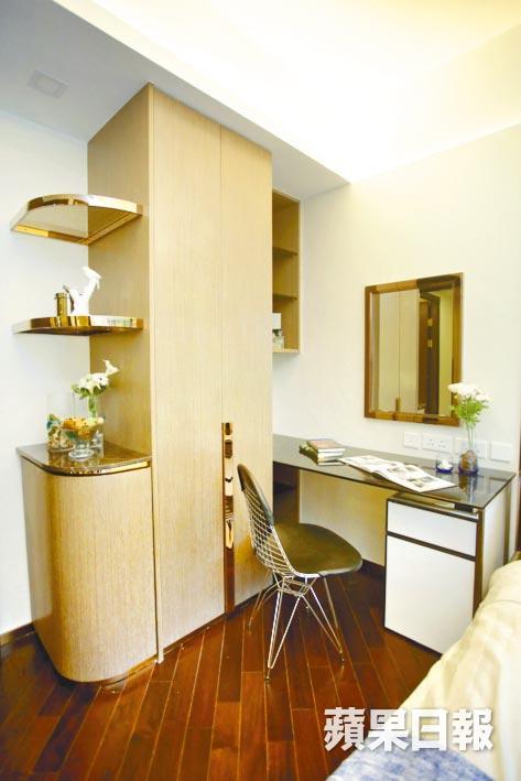 其餘三間房,兩間做睡房,子女長期在外國工作,放假回港短住,房間設計舒適至上,首要擺放5呎雙人床,床頭貼和暖的啡色牆紙,家具選用相同色系,包括以洗水玫瑰木及仿皮造衣櫃飾面,點綴玫瑰金鏡鋼,呼應單位主題。