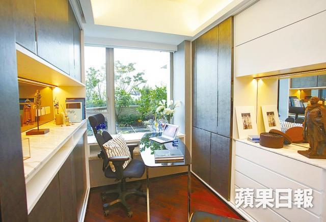 書房是男戶主的天地,想有冷酷型格味,以黑白灰色佈局,兩旁大櫃髹白油配白雲石枱面,拼深灰仿皮及鑲灰鋼幼枝,深沉但有亮澤,展現朝氣活力。書枱配黑玻璃弧形枱面,刻意打橫放,部份騎在窗台上,為何不整張枱建於窗台上?因為現在書枱橫向,日照從側旁透入室,書寫時不會出現手影遮光的問題,而且按現時座位方向,將來靠邊牆壁安裝電視,收看方便。