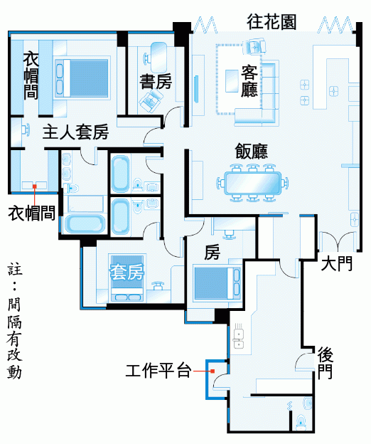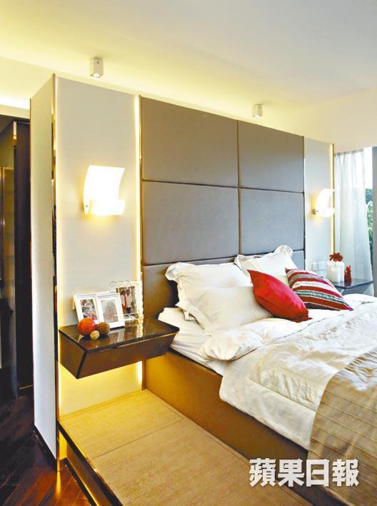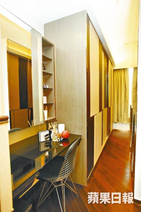 戶主衣物多不勝數,鞋履數百對,主人套房交樓標準衣帽間不夠用,要求有更多貯物空間,設計有三招,兩招是偷位,以寢區為中心,前方近書房偷位造數組鞋櫃,後方闢出衣帽間,左右造兩排大櫃,第三招寢區升高1呎造地台,整個地下填得滿滿,三招貯物量大增,滿足需要。值得一提,地台貯物之餘,高度至窗邊,地氈面積增加,空間感較大,而站於地台上,外望海景亦多,集三種好處於一身。