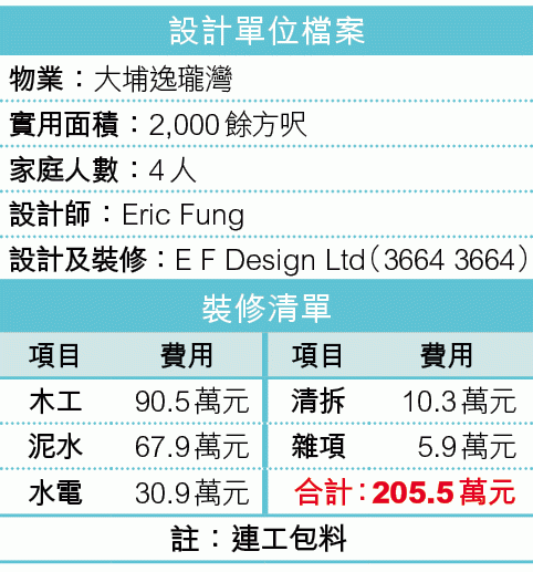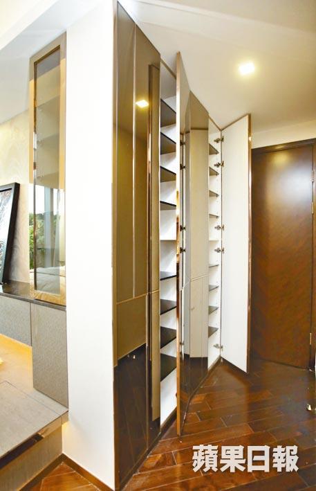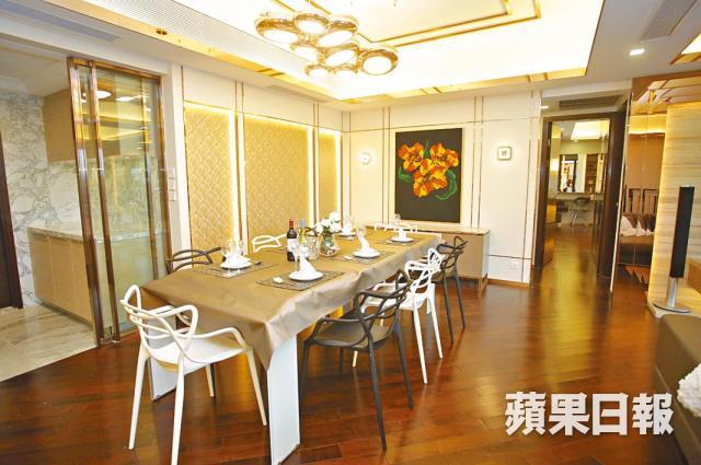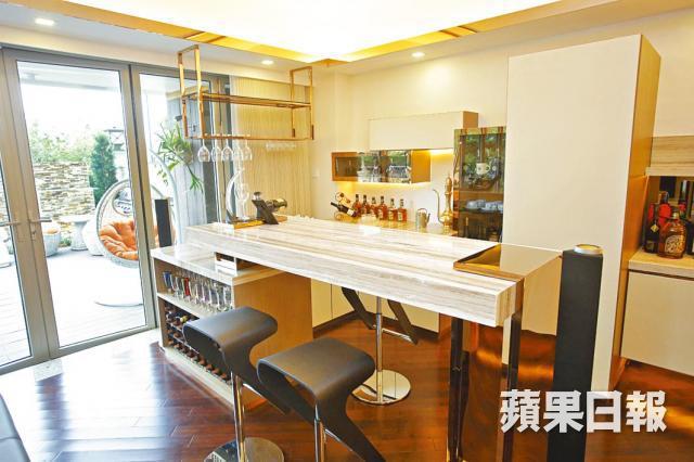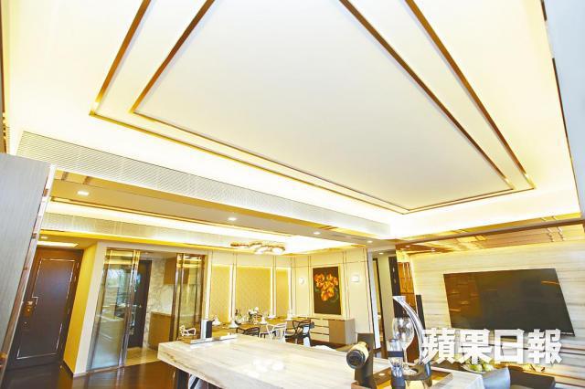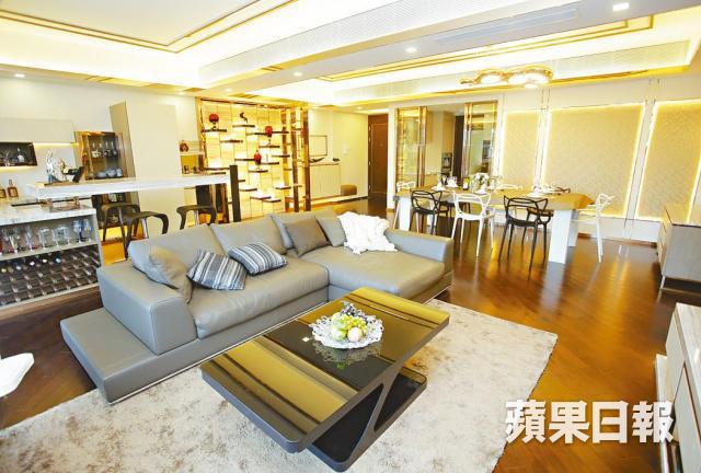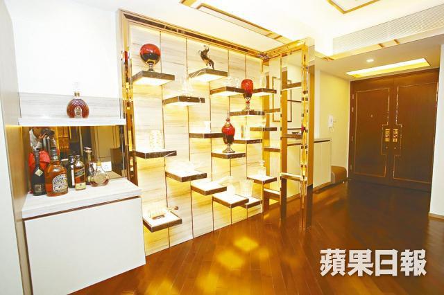 新晉豪宅屋苑大碼特色戶價值近半億元,住在貴重物業豈會甘於平凡的佈局,追求裝潢華麗是個人生活態度,重點以玫瑰金鏡鋼及高級雲石打造豪氣之家,假天花、牆飾及家具皆如此,金光璀璨悅目程度,比起示範單位有過之而無不及,但奢侈得來亦實用,客廳設置酒吧,主人套房再添衣帽間,空間增值「大而有當」。