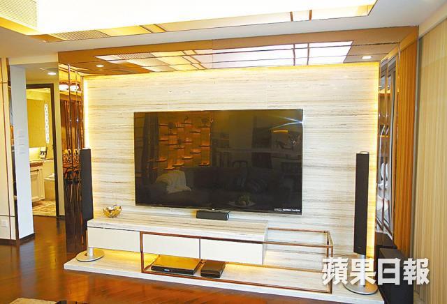 此屋設計順應本來的交樓標準,為配合相同色調及建材,運用玫瑰金鏡鋼造假天花、屏風、層架及牆飾板等,不同的是鏡鋼有拋光發亮及如鏡反照效果,更耀眼生輝,加上水晶木紋雲石造電視及層架背板,石材白底透啡色紋理,屬上等貨色,時尚與華貴互融一起。