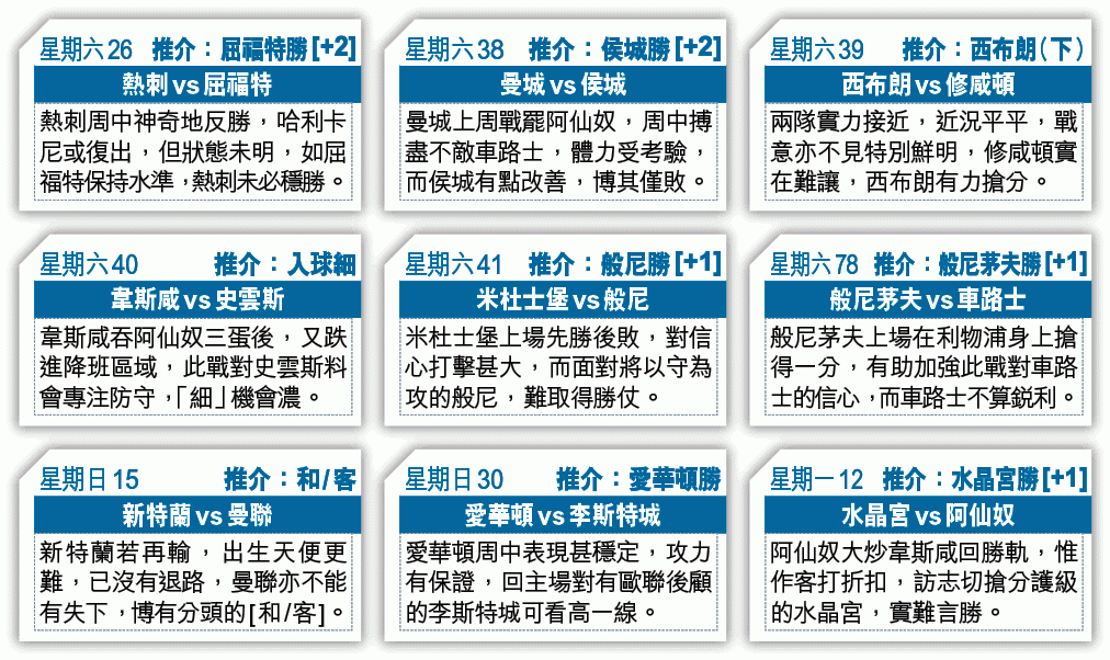 利物浦周中英超在補時階段遭般尼茅夫逼和,痛失兩分的同時,還進一步打擊球員的信心,周六作客史篤城續缺沙迪奧文尼、拉爾拉拿及佐敦軒達臣三名中前場主力;在「主勝」賠率明顯偏熱下,史篤城[+1]可作為今周重心。