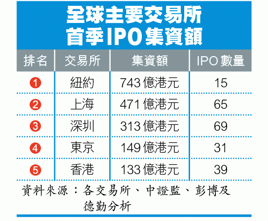 紐約交易所成為首季IPO融資額最多的交易所,集資額達743億元;其次是上交所及深交所,分別集資471億及313億元。歐振興指出,即使本港上季新股融資規模較小,但認購反應非常理想,全數IPO均錄得超額認購,是「好耐冇見過」的情況,反映散戶投資氣氛仍然理想。