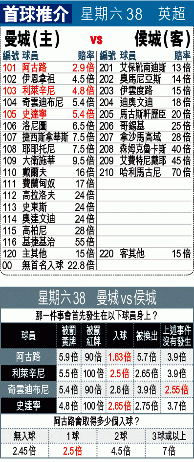 曼城連續四場聯賽失分,目前已跌至第四,為力保前四以獲下季歐聯參賽資格,在周六的英超迎戰尾四的「老虎」侯城時定去盡。由於曼城人腳與實力均在侯城之上,而侯城作客亦表現差,「讓球」就算「藍月」讓兩球,都照捧上盤。(球賽編號:星期六38;now622台及樂視今日10:00pm直播)
