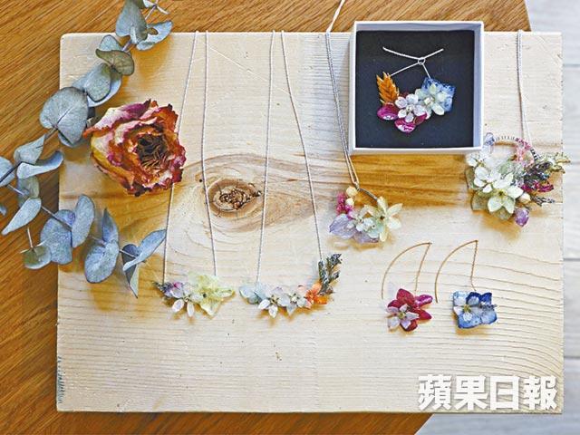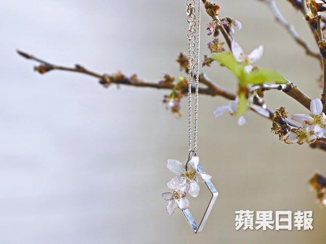 「上年到福岡旅行,恰巧遇上櫻花滿開期,當地滿佈櫻花樹。」不諳日文的Samantha,膽粗粗用英文輔以身體語言,向當地花商購入一株櫻花。把原束鮮花倒吊是較普遍的製乾花方法,但櫻花的花瓣脆弱,需用乾燥砂乾燥後才能帶回香港。她用UV膠凝住櫻花綻放一刻,設計出簡約永恆的櫻花首飾。