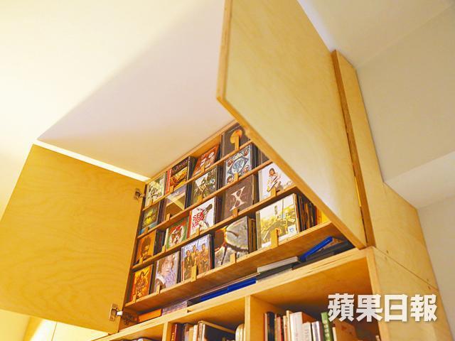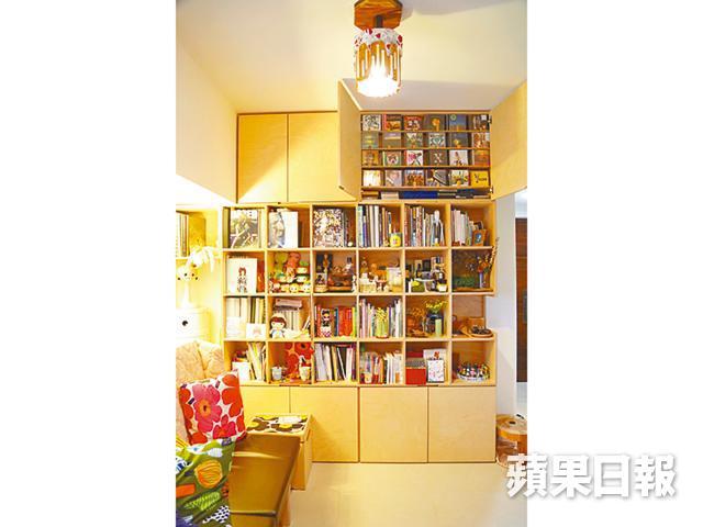 要數全屋體積最大的自製家具,該是客廳靠牆的大書櫃。整個書櫃都以「卡榫」方法,將多塊偏白色的俄羅斯樺木六分夾板卡在一起,組成一格格儲書空間,櫃身既平且滑,加上木材經過處理,遇水也不易爆開受損,非常耐用。不少單位都有大型橫樑阻擋天花,令櫃難以向高空發展,但陳家維就突破這個限制,於書櫃頂層特意造一個狹窄小櫃,存放CD,將橫樑劣勢扭轉乾坤。由於書櫃體積佔客廳一整幅牆,加上單位不大,幾乎甫進家門,已可伸手觸及櫃身,所以陳家維特意在櫃身近玄關的位置開了一個凹位,方便擺放銀包、鎖匙,出門時就能確認自己帶齊這些必需品了。