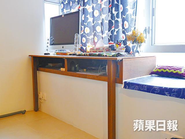 客廳旁是開放式工作間,放有一張依窗台而建的書枱。「這張書枱的設計,主要是針對這種騙錢的大窗台。」他笑說。書枱只有兩隻枱腳,看似古怪,但原來內有乾坤:使用時可以直接把枱面連帶有滾輪的枱腳拉出,枱底下的物件一目了然,可以輕易存放和取出物品,同時也不怕工作時「頂腳」,設計得相當精緻巧妙。由於書枱置於大窗台,為免翻風落雨弄濕書枱,陳家維特意用上防水夾板(Water and Boil Proof Plywood),讓書枱濕水後不致裂開,而書枱邊就用上柚木襯托,近書枱中央位置更特意鑲嵌了之前在葡萄牙公幹時購入的瓷磚,點綴本來只有平實褐色的書枱,令整張書枱更為奪目。
