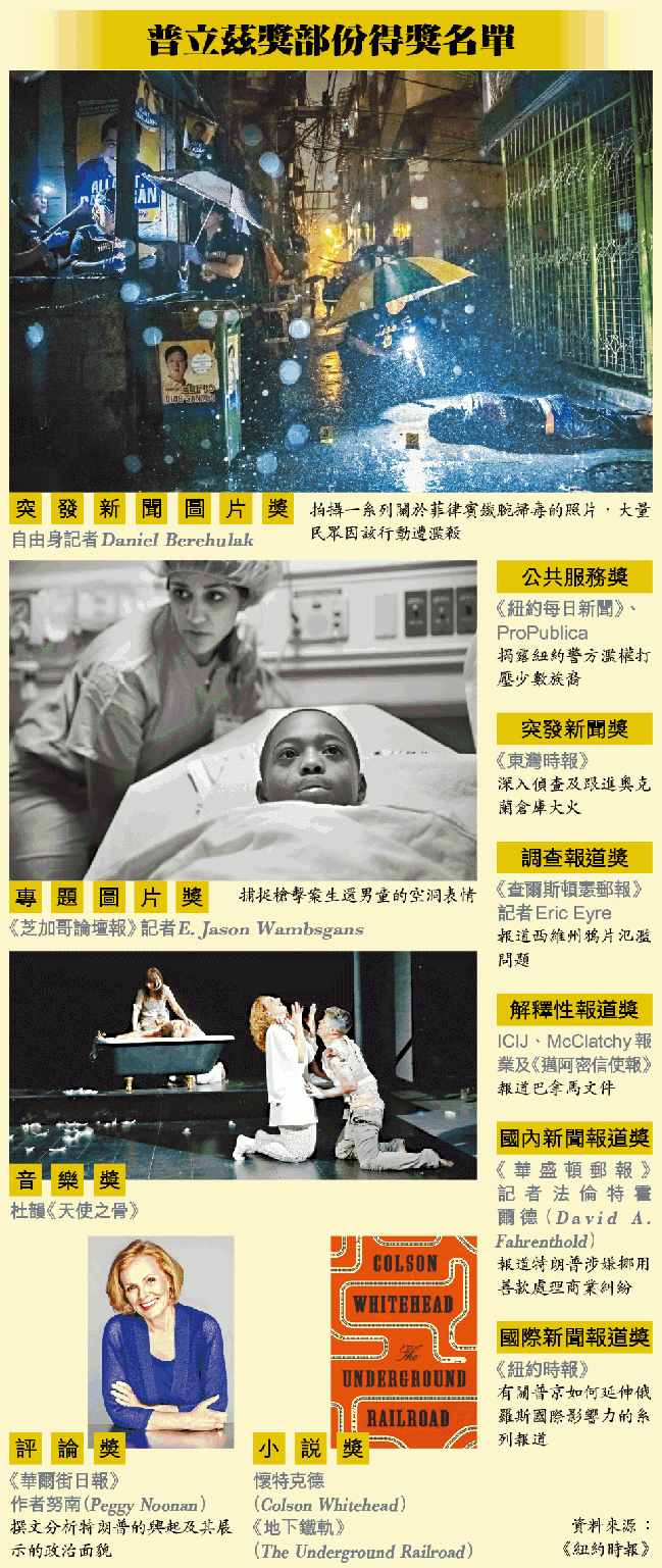 《紐約時報》獲國際新聞報道獎的系列報道,則披露普京透過暗殺和插贓嫁禍政敵,以及網上「五毛黨」等方法,在國外擴張影響力。《紐時》亦是今年唯一得超過一個新聞獎的機構,另憑一士兵退役後陷暴力殺戮的故事獲專題報道獎;獲突發新聞圖片獎的菲律賓反毒戰照片,亦在該報刊登。