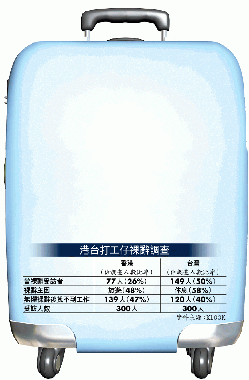 【本報訊】近年裸辭成風,網上旅遊平台KLOOK一項港台打工仔裸辭及請假調查,在網上及街頭成功訪問港台各300人,26%受訪港人表示曾裸辭,當中48%稱裸辭原因是去旅行(佔總數約12%),其次是健康,佔26%;台灣受訪者則有50%表示曾裸辭,主因想休息一下(58%),其次是進修(26%)。