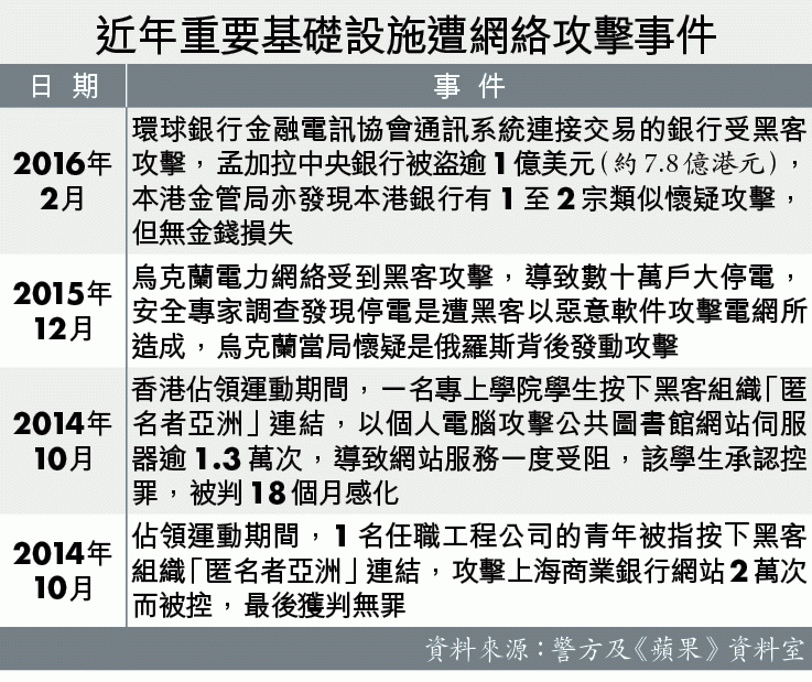 前年烏克蘭電力網絡受到黑客攻擊,導致數十萬戶大停電,調查發現是黑客以惡意軟件攻擊電網所造成。去年環球銀行金融電訊協會通訊系統連接交易的銀行受黑客攻擊,孟加拉中央銀行被盜逾1億美元(約7.8億港元),本港金管局事後發現有1至2宗本港銀行受類似懷疑攻擊,但並無金錢損失。
