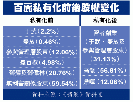 按百麗已發行股數共84.34億股計,私有化原涉資超過531億元,但因盛放、于武等管理層股東持有的10.17億股及經智者創業持有的2.24億股,合共佔14.72%權益,他們將與要約人簽定「存續協議」轉讓持股,代價則由智者創業按註銷代價價格向參與管理層股東發行合共10.17億股,佔現時已發行股本總額約12.06%,故最終涉及現金要約的僅為71.92億股,涉及453億元。