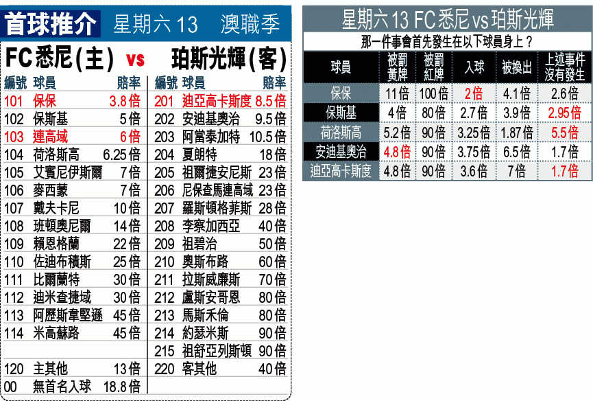 澳職季後賽踏入準決賽階段,常規賽冠軍FC悉尼率先在周六登場,主場鬥珀斯光輝;FC悉尼今季主場威力強勁,就算中場大將連高域上陣成疑,仍力足大勝光輝晉級,「讓球」主隊狠讓一球/球半,仍照取上盤。(球賽編號:星期六13;有線64及203台今日5:50pm直播)