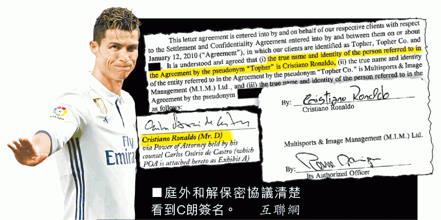 【綜合德國外電】皇家馬德里前鋒基斯坦奴朗拿度(C朗),涉及09年強姦一名美國女子醜聞,繼續被「唧牙膏」式爆料,德國《明鏡周刊》刊登C朗與受害女子庭外和解的法律文件,找到C朗的親筆簽署。