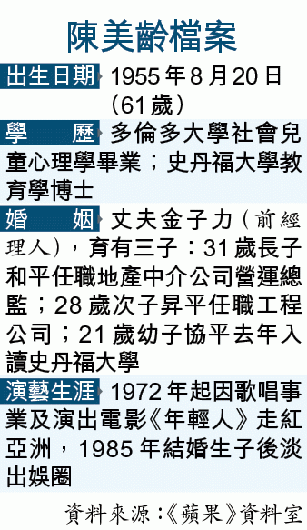 陳美齡1970年代起活躍於娛樂圈,拍攝電影《年輕人》及獲日本歌手邀請灌錄唱片,成為東南亞及日本的人氣偶像。她於1985年下嫁日籍經理人金子力,誕下三子,2007年曾患上乳腺癌,抗癌5年康復。陳美齡四母子都就讀過史丹福大學,去年出新書講育兒心得,亦不時在公開場合談教育,曾指TSA應該以自願性質進行,又對學童輕生現象感到痛心。
