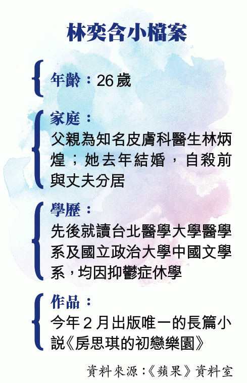 林奕含今年初才出版首部小說《房思琪的初戀樂園》;這名外形亮麗、甚具氣質的女作家被視為文壇新星,其死訊傳出後震驚不少書迷。