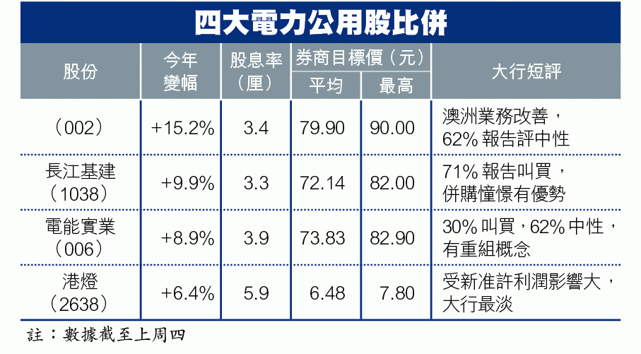 而四大電力公用股中,大行普遍最睇好長建,原因包括集團積極參與併購、有電能資金支持,以及本港業務比重較低。兩電日前與政府達成新的利潤管制協議,將准許利潤降至8%,由於長建持有港燈,新准許利潤對長建亦有影響,惟有關收入佔長建整體利潤不足5%。