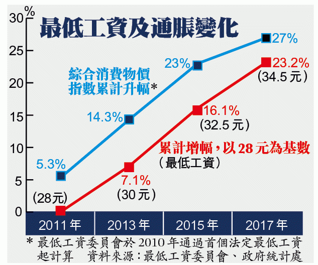 她記得6年前首次有最低工資時,一個麵包只賣2元,「𠵱家要6、7蚊」。最低工資委員會於2010年8月通過首個法定最低工資,時薪為28元,但翌年5月1日才生效,數據已滯後。統計處資料顯示,2010年至2017年3月通脹累計為27%,甲類消費物價指數更累升逾31%,但最低工資經歷3次調整,只累增23.2%,反映工資沒實質增長。