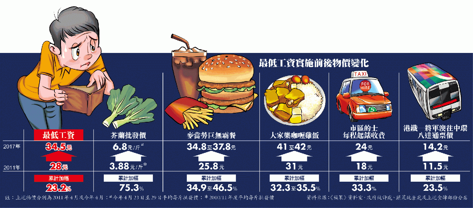 本報對比部份物價變化,最低工資實施前,麥當勞巨無霸餐只售25.8元,今天普遍已加至34.8元至37.8元不等,增幅34.9%至46.5%;部份大家樂分店午市一碟咖喱雞飯也漲價41或42元不等,累計加幅35.5%。蔬菜統營處紀錄更顯示,當年每斤芥蘭平均批發價為3.88元,上周已增至6.8元,加幅高達75.3%。
