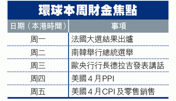 至於外圍本周重要事項,有法國大選結果今出爐,最新民調顯示中間派的馬克龍將當選總統,料他將推動歐洲央行收緊貨幣政策。另外歐央行行長德拉吉周三發表講話;英倫銀行周四公佈議息結果,料當局按兵不動;南韓總統選舉周二舉行。