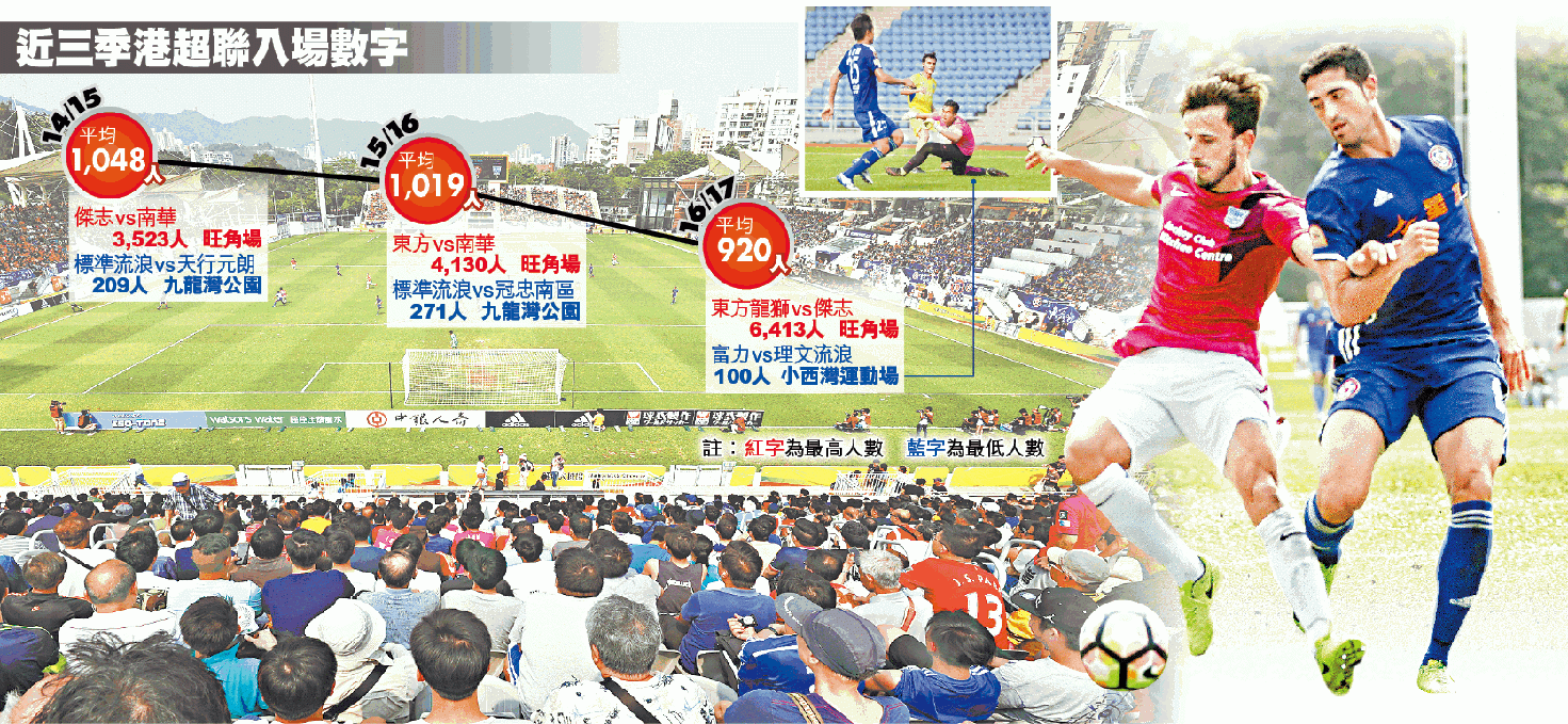 第三屆港超聯上周六煞科,東方龍獅對傑志的「冠軍戰」吸引6,413名球迷進場,成功坐滿旺角場,但同日在小西灣運動場上演的富力對理文流浪則創下今季新低,只得100名觀眾,總結全季港超平均入場人數再跌9.7%,連跌兩季,當中「空降」參賽的富力包辦五場最少球迷賽事,可說是「球市毒藥」。記者:曾雁平