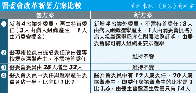 政府於三方平台最後一次會議,提出「4-2+2方案」作討論,即增加4名選舉產生的業外委員,當中3人由病人組織選舉產生,1人由消委會提名。病人組織需由醫委會認可及安排選舉。醫專2席由特首委任改為選舉產生,選舉辦法由醫專決定。醫委會由28人增至32人,當中12人屬委任,20人由選舉產生。但當中由業界普選產生的醫生委員只有14人,未及醫委會32名委員的一半。