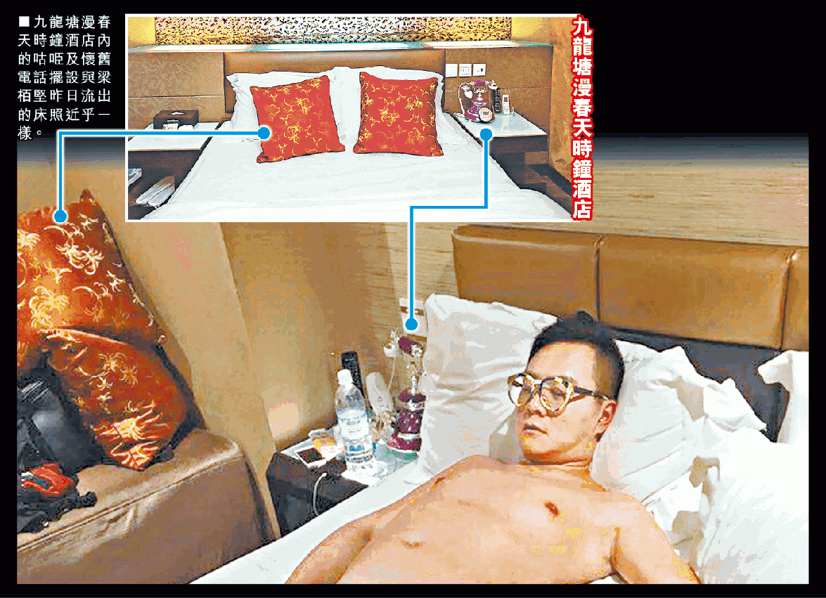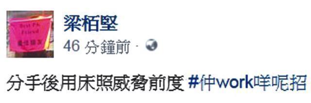 閨蜜更提供了「梁栢堅」在床上的全身相,見到他右腳的紋身,證明是同一人,而酒店房的相片,似是澳門銀河酒店及九龍塘漫春天酒店。昨日本報多次聯絡梁栢堅都沒回覆,他只在facebook留言:「分手後用床照威脅前度」、「仲work咩呢招」。本報記者向陸偉雄律師查詢「以床照威脅」是否構成刑事罪?他在電話說:「任何人士做任何行為、言語,總之令到對方受驚,已經觸犯刑事恐嚇罪。如果唔係當事人想復合,而係第三者爆出嚟,刑事恐嚇目的唔明顯,唯一辦法向法庭申請緊急禁制令,有冇刑事成份要警方調查。」問到床照版權是否屬兩人共同擁有?陸律師表示:「呢啲冇版權,因為法律上冇登記冇註冊。」