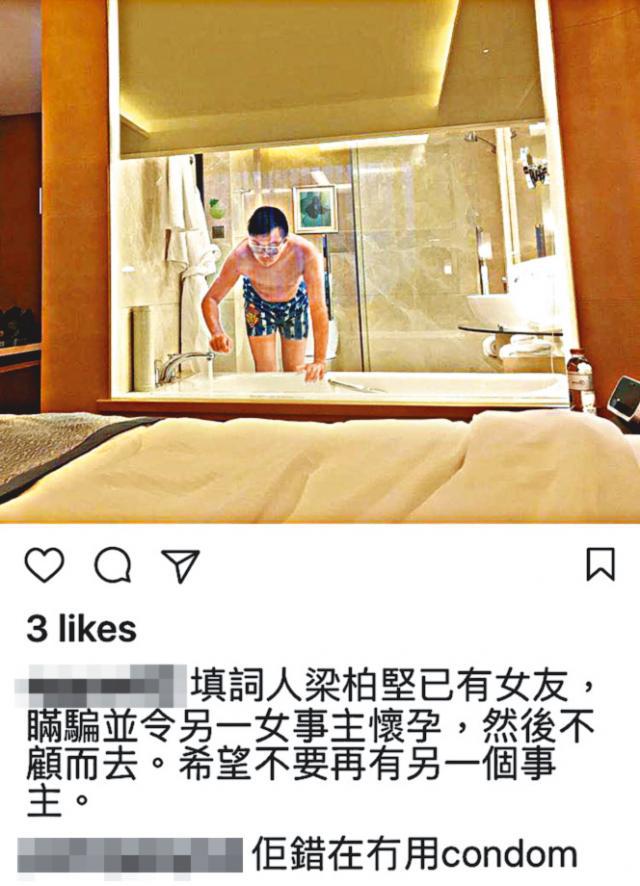 昨日有女網友在Instagram公開兩張梁栢堅的半裸相,一張是戴白色框眼鏡,着孖煙囪的他在酒店浴室開浴缸水,另一張是戴雙色框眼鏡瞓在床上,網友留言:「填詞人梁栢堅已有女友,瞞騙並令另一女事主懷孕,然後不顧而去,希望不要再有另一個事主。」本報聯絡女網友了解,對方聲稱是女事主Ivy(假名)的閨蜜,由於不值梁所為爆大鑊,閨蜜聲稱:「Ivy同梁栢堅喺一年前經朋友介紹認識,過咗一個月,二人開始有性關係,當時梁栢堅自稱單身,性行為一直冇做安全措施,因為梁栢堅話自己年紀大,識避到,唔使用,Ivy信佢,點知最後發現自己有咗BB。」