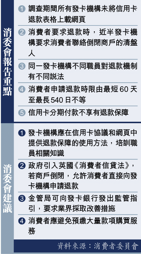 消委會去年訪問16間發卡及信用卡機構,發現所有機構都提供退款保障,但機制欠缺透明度。所有受訪機構網頁沒有退款表格可下載,消費者只能透過熱線電話查詢。即使致電查詢,近半機構職員要求消費者自行找已倒閉商戶的清盤人申請退款。