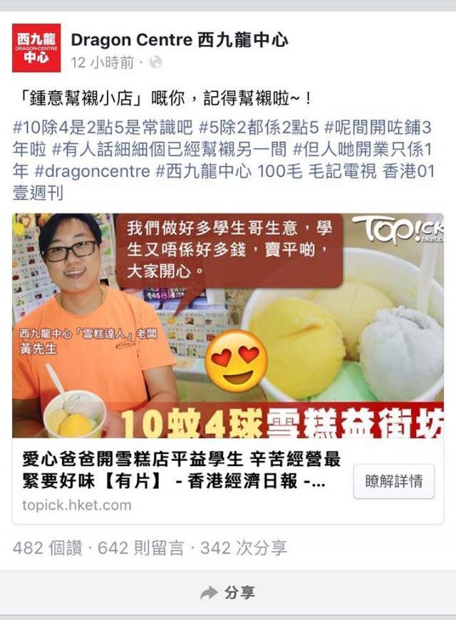 深水埗西九龍中心在5月8日轉載8樓一間賣10蚊4球雪糕小店的報導,並留下不少寸嘴hashtag──「鍾意幫襯小店你記得幫襯啦」、「10除4是2點5是常識吧」等等,疑似影射早前同樓層不獲續租的5蚊兩球雪糕車仔舖「Ice Cha Cha」,隨即引來關公災難。