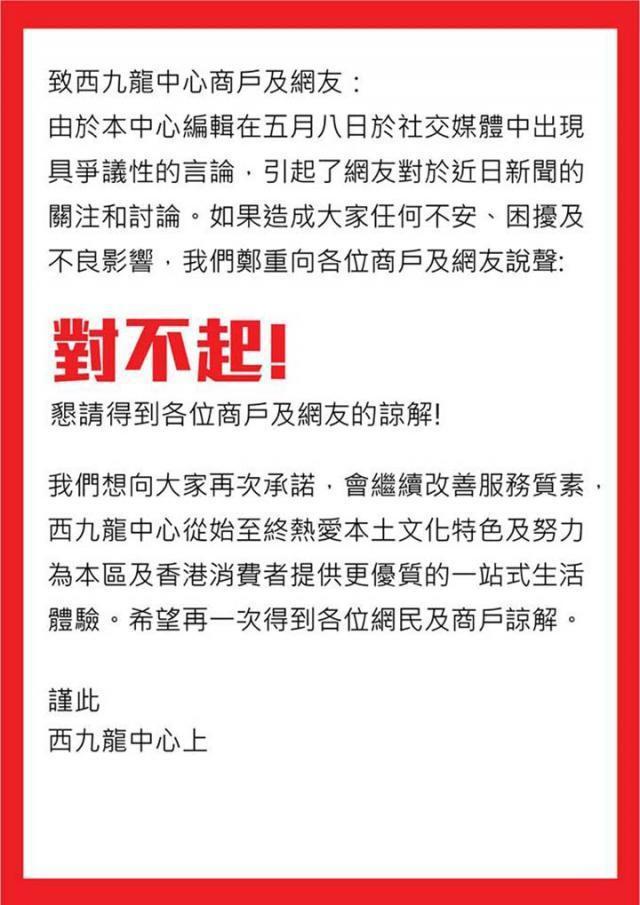 至5月9日下午1時許,西九龍中心在facebook發新帖致歉,指編輯昨於facebook出現「具爭議性的言論」,引起網友對近日新聞的關注及討論,記者亦致電西九龍中心公關部門,回覆指他們承認處理不當,希望各位繼續支持小商戶,不過似乎網民並不接受,仍然不停地派嬲嬲。