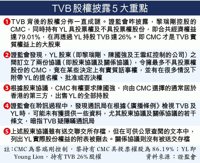 證監會更發現,YL股東之間更訂立了兩份協議(分別為股東協議及關係協議),令擁最多不具投票權股份的CMC,竟在某些決定上有實質話事權,並在很多情況下附帶YL的提名權、批准或否決權;更可有權要求陳國強,向由CMC選擇的通常居於香港的第三方,出售YL的全部持股。這些權力明顯與一般不具投票權的股份權益不同,意味黎才是YL以及TVB實質話事人。