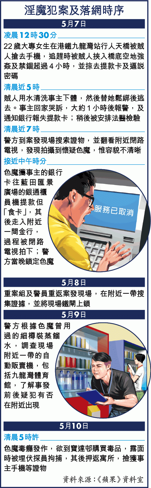 【本報訊】本周日凌晨港鐵九龍灣站發生的天橋底姦劫案,警方憑着色魔用事主提款卡在藍田匯景廣場自動櫃員機提款時,被閉路電視拍下的容貌追查,鎖定色魔身份,於案發後72小時、昨晨趁有毒癮的色魔往吸毒時,在秀茂坪寶達邨將他拘捕。消息稱被捕色魔犯案纍纍,年僅9歲已曾被捕,今次是他首度犯風化案。據悉,他強姦案中22歲少女後,禁錮對方「談心」,聲稱想和事主交朋友。