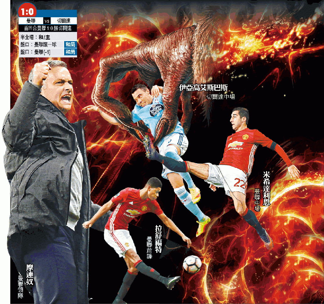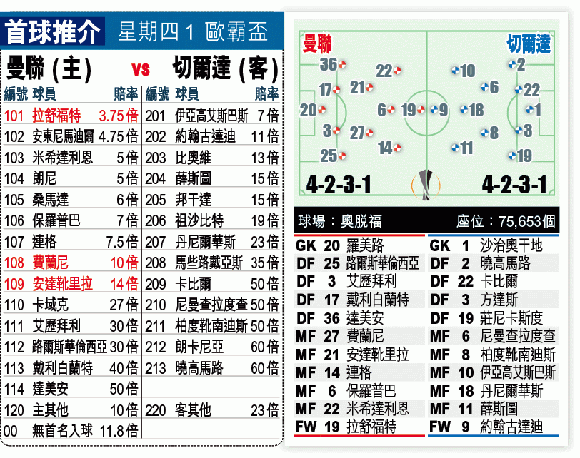 曼聯棄英超爭歐霸,周四歐霸盃四強次回合戰,紅魔於主場再戰切爾達,要保首回合1:0優勢爭入決賽,主帥摩連奴勢以守為先,決捧[2.5球]「細」。