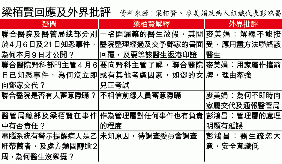 梁栢賢昨親自為事件解畫,指聯合醫院腎科部門主管於上月6日知悉,向鄧桂思開漏抗病毒藥,但沒即時向其家屬交代。鄧的女兒Michelle上月19日向聯合醫院查詢,該腎科主管正放假,內科部門主管接見Michelle,因該主管不掌握事件詳情,兩日後即21日才能詳細向Michelle解釋事件,同日聯合醫院行政總監徐德義致電梁交代事件。