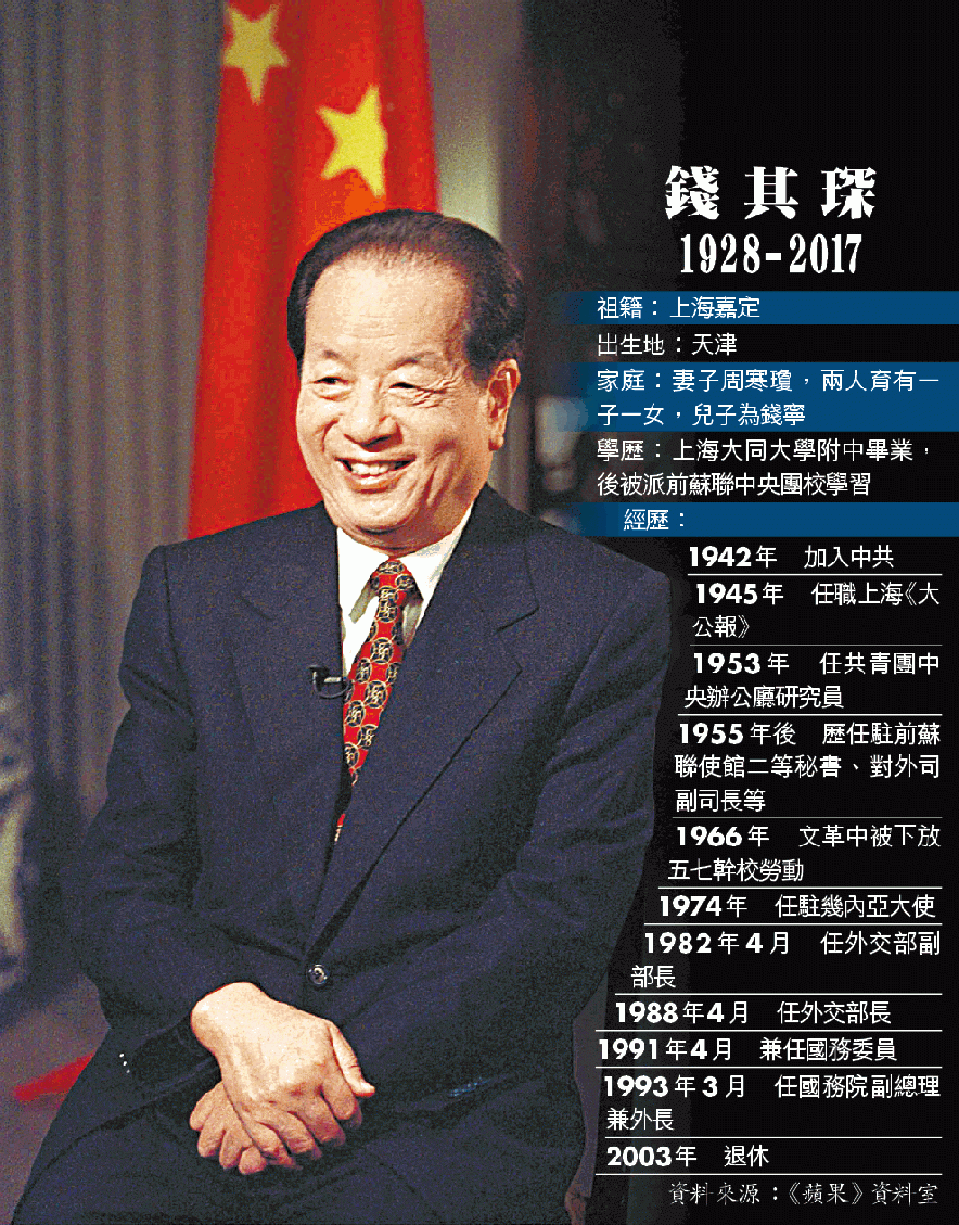 有中國外交教父之稱、曾任國務院副總理兼外交部長、掌舵對港澳對台事務的錢其琛,因病於前晚10時零6分於北京逝世,終年89歲。錢在1989年六四事件後,致力打破西方國家對中國的制裁;也在香港回歸中扮演重要角色。本港時事評論員劉銳紹指,錢是個較開明的官員,在具體執行外交政策時能彈性靈活處理,從而為中國爭取最大利益。