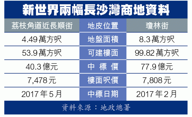 【本報訊】新世界(017)耗資逾118億,三個月內連掃兩幅長沙灣商地。上周五截標的長沙灣荔枝角道近長順街商業地,由新世界以近40.3億元奪得,每呎樓面地價7,478元,合乎市場預期,比同系2月奪得的同區瓊林街商貿地低4%。連同今年初投得同區商貿地和補價地,區內擁有約173萬方呎土地儲備。