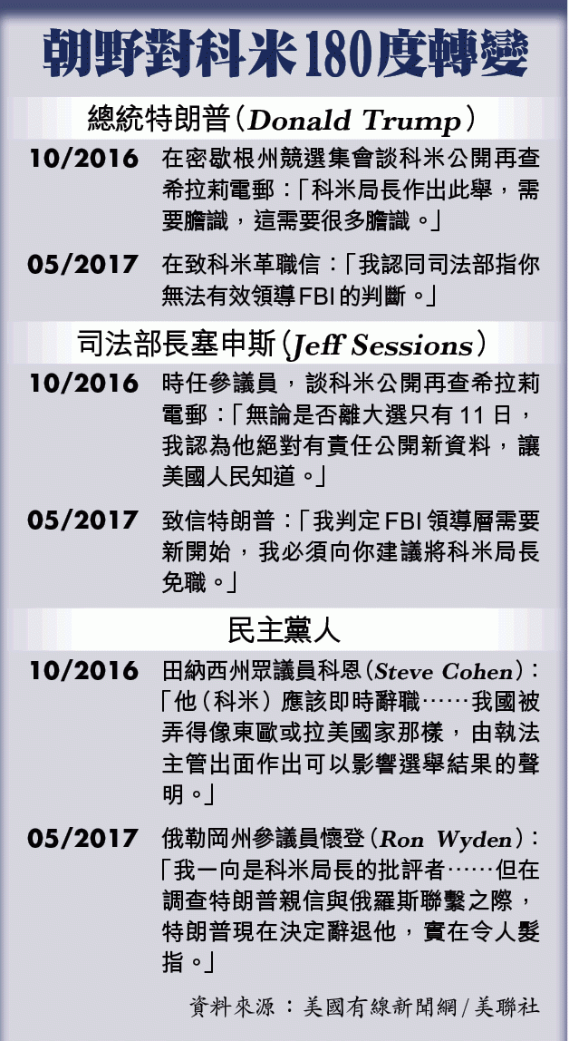 去年7月5日科米召開直播記者會,不建議就以私人伺服器處理公務電郵的「電郵門」事件,起訴當時民主黨總統候選人希拉莉,但斥責她「極度大意」;10月28日,即大選前不足兩周,科米卻去信國會通報重新調查「電郵門」。這兩次罕見且極具爭議的舉措,讓科米成為大選乃至美國政壇焦點人物,亦埋下他前天遭特朗普革職的伏線。